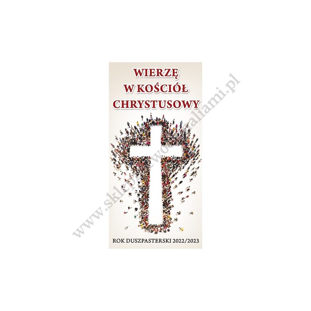 Okolicznościowa dekoracja z hasłem roku duszpasterskiego 2022/2023 - "Wierzę w kościół Chrystusowy" w postaci banera wydrukowanego w wysokiej rozdzielczości na bardzo dobrej jakości materiale odpornym na wszelkie warunki atmosferyczne.