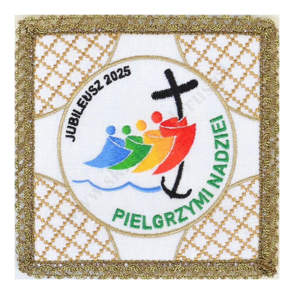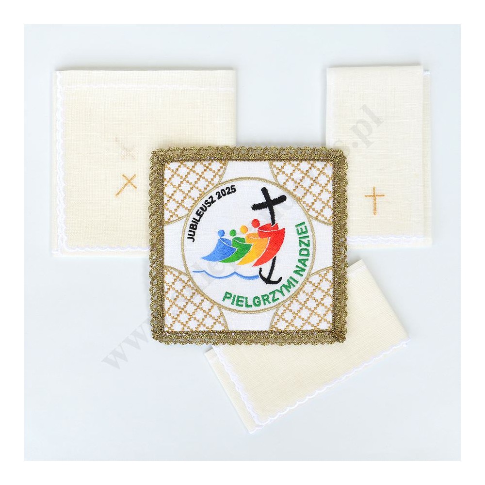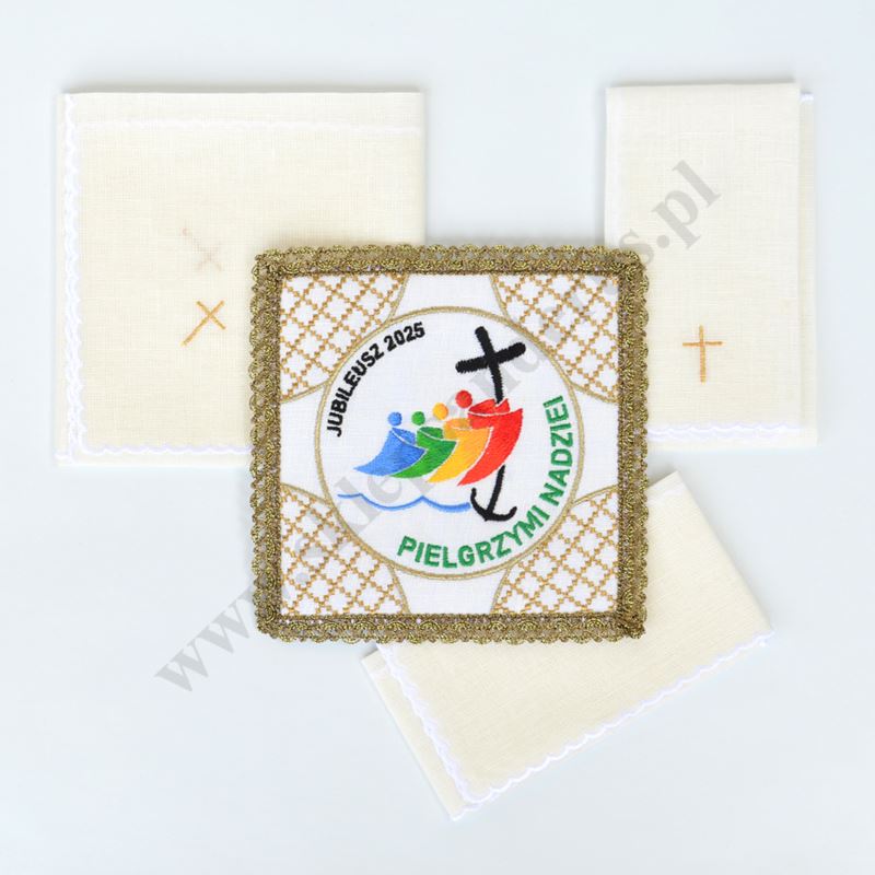 Komplet kielichowy wykonano za pomocą wysokiej jakości tkaniny lnianej. Dodatkowo ozdobiono ją haftem z logo Roku Jubileuszowego 2025. Komplet kielichowy składa się z czterech części: palki, korporału, puryfikaterza i ręczniczka zrobionych z bawełny.