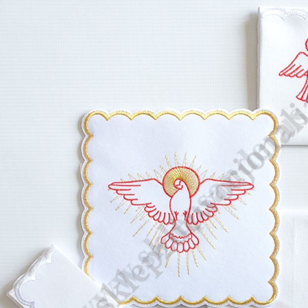 Komplet bielizny kielichowej zdobiony haftem z motywem Ducha Świętego, 100% bawełna. W skład kompletu wchodzi: palka, korporał, puryfikaterz oraz ręczniczek.