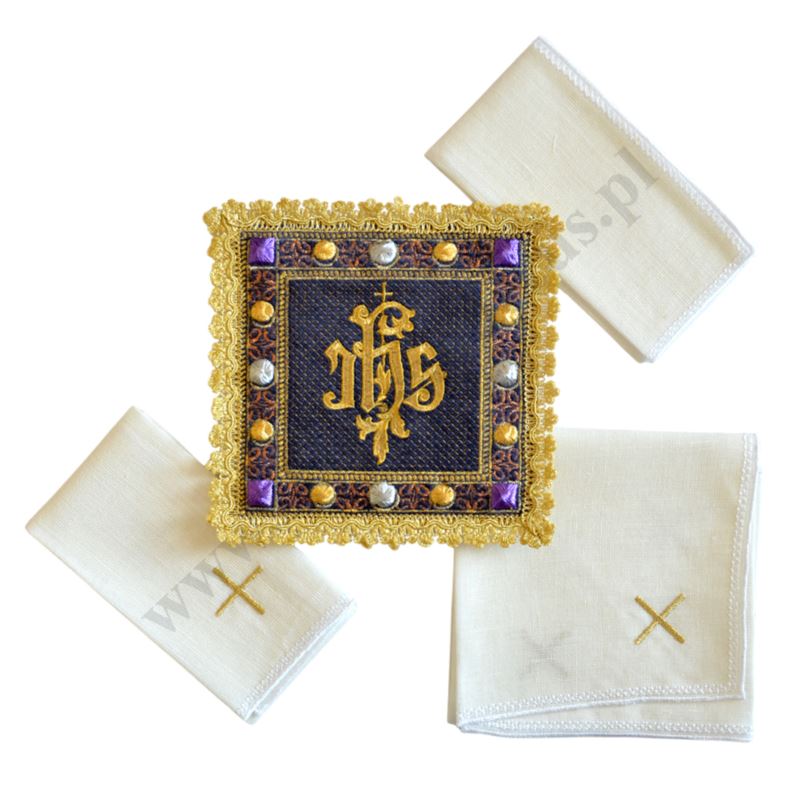 Prezentowany zestaw bielizny kielichowej to niezwykły wybór dla każdego, kto ceni sobie wysoką jakość i elegancję. Został wykonany z najwyższej jakości tkaniny, zdobionej haftowanymi, kolorowymi kamieniami oraz haftowanym, złotą nicią, symbolem IHS.