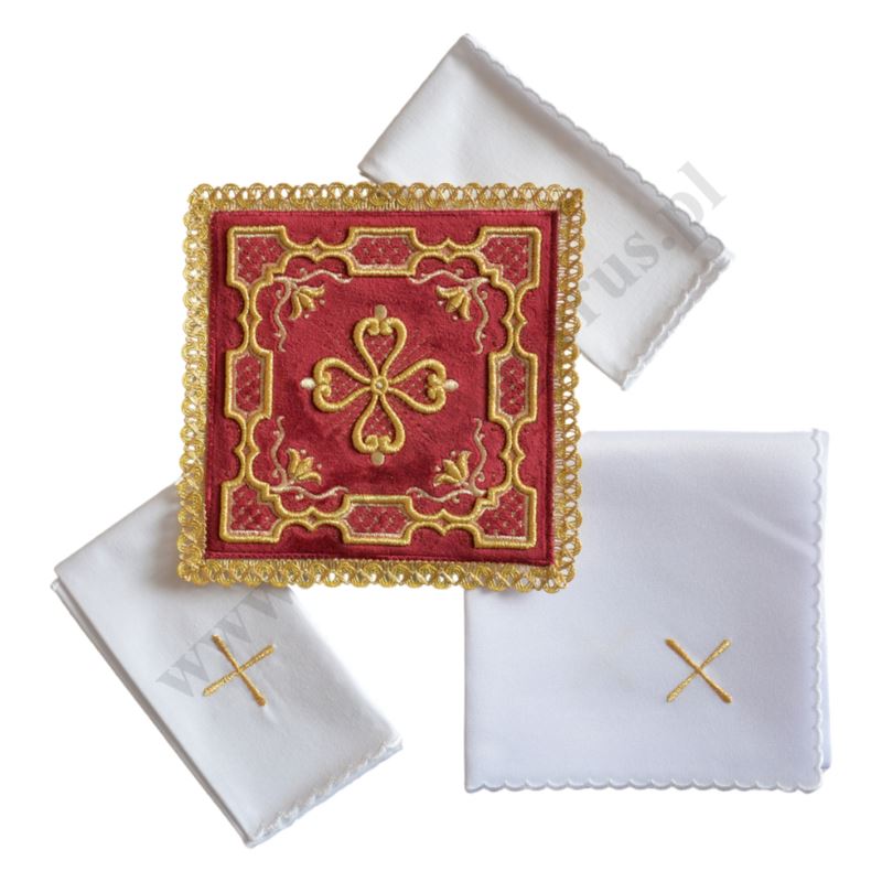 Bielizna kielichowa wykonana z wysokiej jakości tkaniny, zdobiona haftem wypukłym z motywem eucharystycznym. Komplet składa się z czterech części: