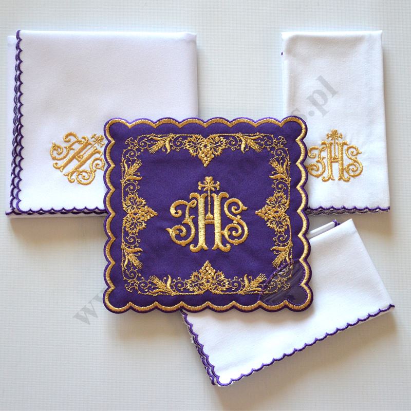 Bielizna kielichowa wykonana z wysokiej jakości tkaniny, zdobiona haftem z motywem eucharystycznym wykonanym złotymi nićmi, który przedstawia krzyż. Komplet składa się z czterech części: palki, korporału, puryfikaterza i ręczniczka.