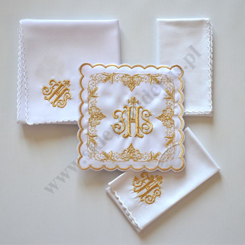 Bielizna kielichowa wykonana z wysokiej jakości tkaniny, zdobiona haftem z motywem eucharystycznym wykonanym złotymi nićmi, który przedstawia symbol IHS. Komplet składa się z czterech części: palki, korporału, puryfikaterza i ręczniczka.