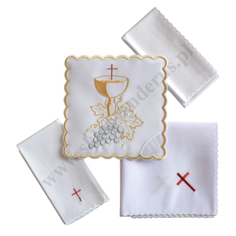 Bielizna kielichowa wykonana z wysokiej jakości tkaniny, zdobiona haftem. Komplet składa się z czterech części: palki, korporału, puryfikaterza i ręczniczka.
