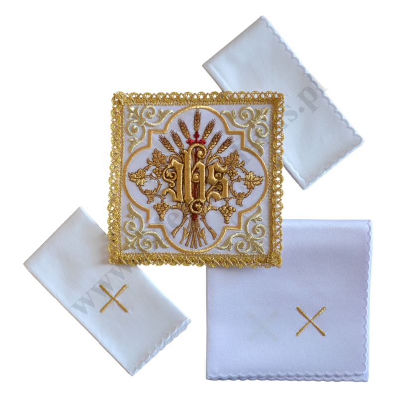 Bielizna kielichowa wykonana z wysokiej jakości tkaniny, zdobiona haftem z motywem IHS wykonanym kolorowymi nićmi. Komplet składa się z czterech części: palki, korporału, puryfikaterza oraz ręczniczka.