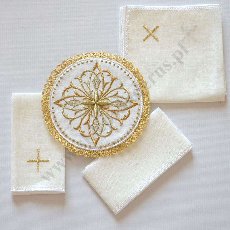 Bielizna kielichowa wykonana z wysokiej jakości tkaniny lnianej, zdobiona haftem z motywem eucharystycznym wykonanym złotymi nićmi. Komplet składa się z czterech części: palki, korporału, puryfikaterza i ręczniczka.