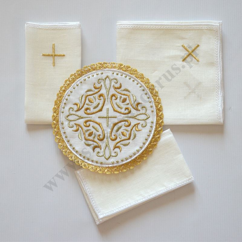 Bielizna kielichowa wykonana z wysokiej jakości tkaniny lnianej, zdobiona haftem z motywem eucharystycznym wykonanym złotymi nićmi. Komplet składa się z czterech części: palki, korporału, puryfikaterza i ręczniczka.