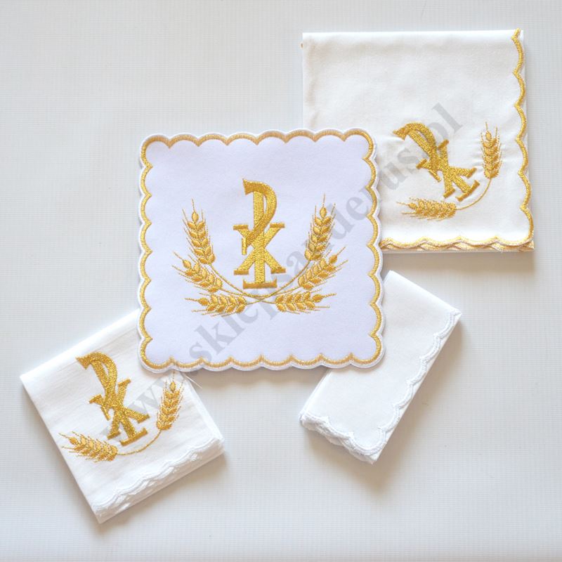 Bielizna kielichowa wykonana z wysokiej jakości tkaniny, zdobiona haftem z motywem eucharystycznym wykonanym złotymi nićmi, który przedstawia symbol PX. Komplet składa się z czterech części: palki, korporału, puryfikaterza i ręczniczka.