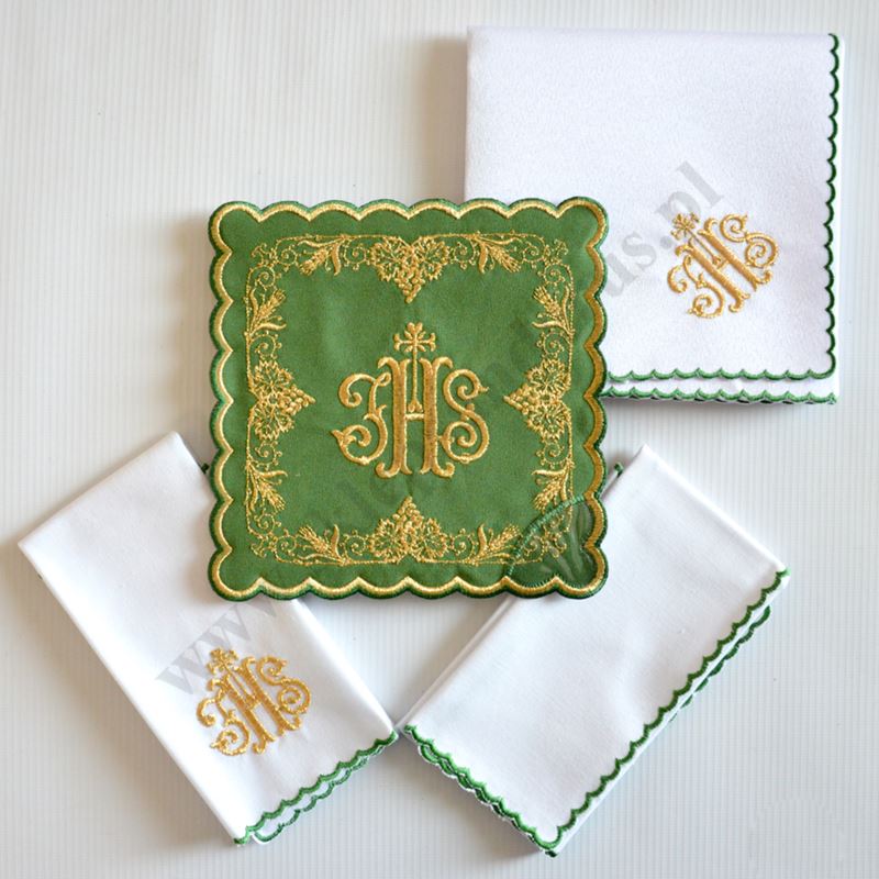 Komplet bielizny kielichowej wykonanej z wysokiej jakości tkaniny, zdobionej haftem z motywem IHS. Komplet składa się z czterech części: palki, korporału, puryfikaterza oraz ręczniczka.