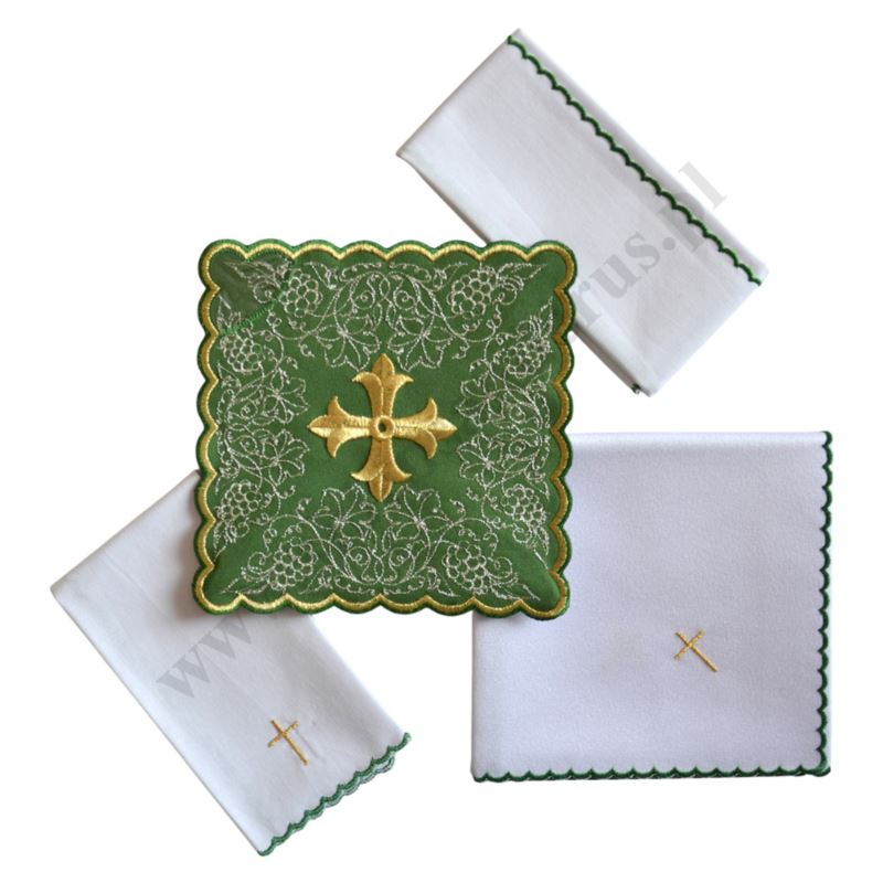 Bielizna kielichowa wykonana z wysokiej jakości tkaniny, zdobiona haftem z motywem krzyża i motywami florystycznymi wykonanymi złotymi nićmi. Dzięki łączącemu elementy motywowi krzyża i zielonej lamówki, zestaw tworzy spójną całość.