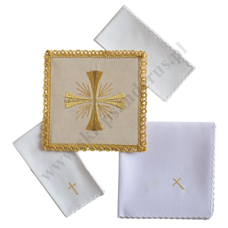 Bielizna kielichowa wykonana z wysokiej jakości tkaniny, zdobiona haftem. Komplet składa się z czterech części: palki, korporału, puryfikaterza i ręczniczka.
