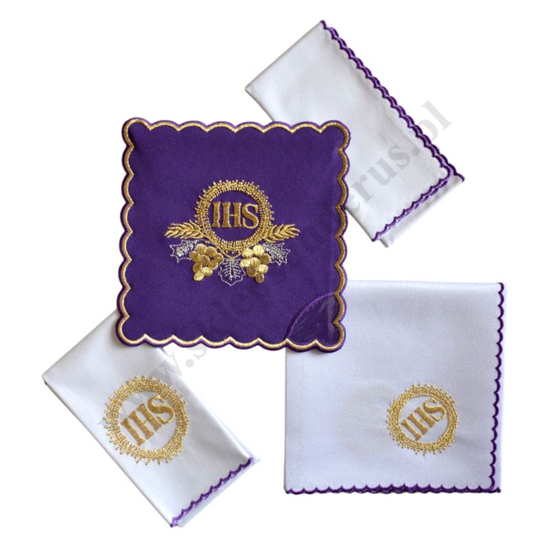 Bielizna kielichowa wykonana z wysokiej jakości tkaniny, zdobiona haftem z motywem eucharystycznym wykonanym złotymi nićmi, który przedstawia symbol IHS i motywy florystyczne.