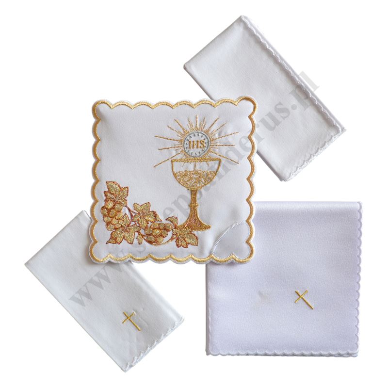 Bielizna kielichowa wykonana z wysokiej jakości tkaniny, zdobiona haftem. Komplet składa się z czterech części: palki, korporału, puryfikaterza i ręczniczka.