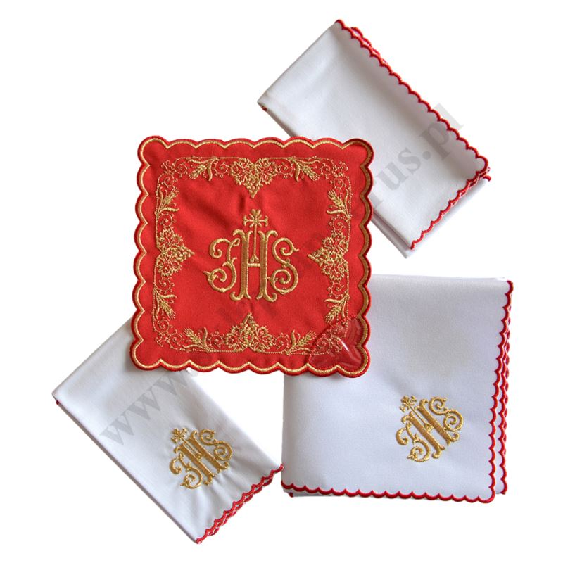 Bielizna kielichowa wykonana z wysokiej jakości tkaniny, zdobiona haftem z motywem eucharystycznym wykonanym złotymi nićmi, który przedstawia symbol IHS i motywy florystyczne. Komplet składa się z czterech części: palki, korporału, puryfikaterza i ręczniczka. Dzięki łączącemu elementy motywowi z symbolem IHS, zestaw tworzy spójną całość.