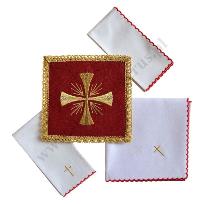 Bielizna kielichowa wykonana z wysokiej jakości tkaniny, zdobiona haftem z motywem krzyża wykonanym złotymi nićmi. Komplet składa się z czterech części: palki, korporału, puryfikaterza i ręczniczka. Dzięki łączącemu elementy motywowi krzyża i czerwonej lamówki, zestaw tworzy spójną całość.