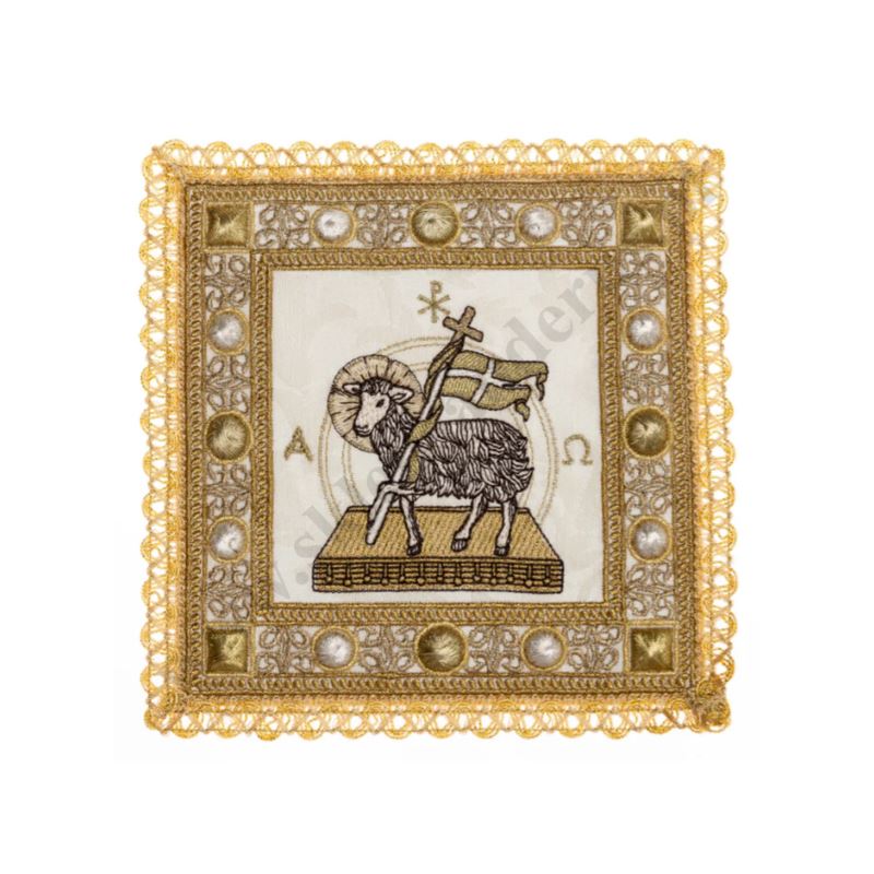 Bielizna kielichowa wykonana z wysokiej jakości tkaniny, zdobiona haftem eucharystycznym wykonanym złotymi nićmi, który przedstawia Baranka Bożego. Komplet kielichowy składa się z czterech części: palki, korporału, puryfikaterza oraz ręczniczka. Ponadto elementy z motywem krzyża stanowią idealne dopełnienie dla palki, na której wyhaftowano symbol Baranka Bożego.