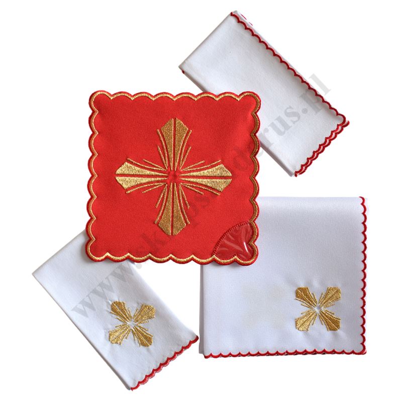 Bielizna kielichowa wykonana z wysokiej jakości tkaniny, zdobiona haftem z motywem krzyża wykonanym złotymi nićmi. Komplet składa się z czterech części: palki, korporału, puryfikaterza i ręczniczka. Dzięki łączącemu elementy motywowi krzyża i czerwonej lamówki, zestaw tworzy spójną całość.