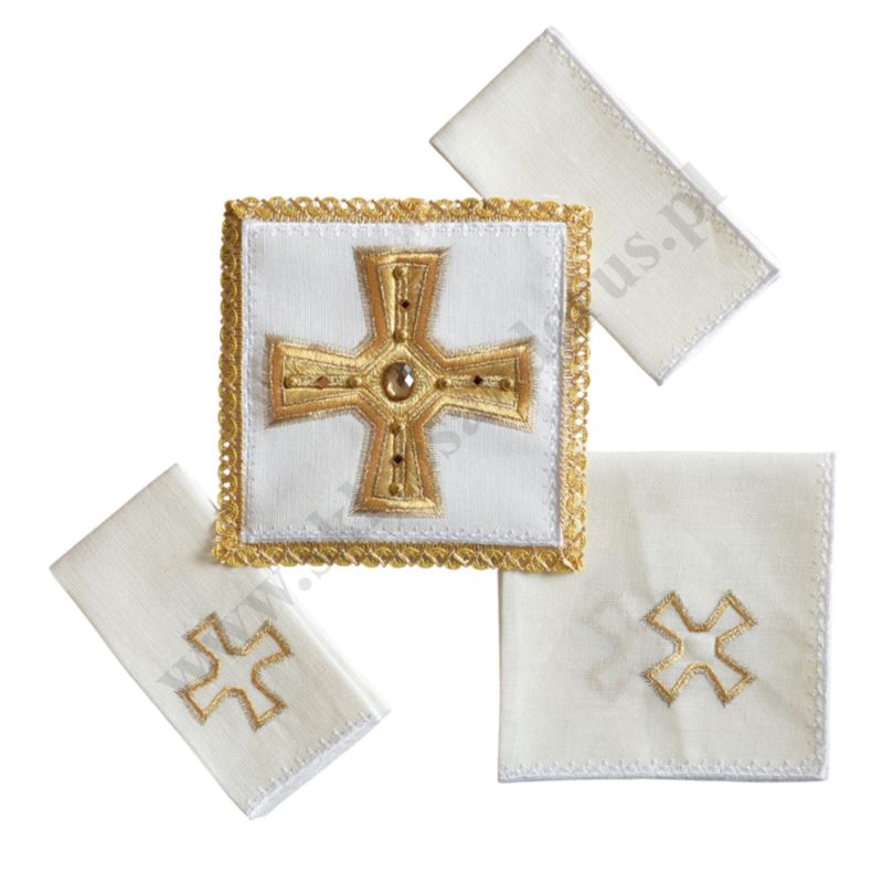 Prezentowany zestaw bielizny kielichowej to niezwykły wybór dla każdego, kto ceni sobie wysoką jakość i elegancję. Został wykonany z najwyższej jakości tkaniny lnianej, zdobionej kolorowymi kamieniami i haftowanym, złotą i srebrną nicią, symbolem krzyża.
