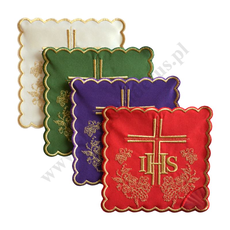 Komplet czterech palek kielichowych w kolorach zielonym, białym, czerwonym i fioletowym z wyhaftowanym motywem eucharystycznym. Dodatkowo jeden z rogów palki zabezpieczono folią ułatwiającą dłuższe utrzymanie w czystości. Wymiar palki 16.5 x 16.5 cm.