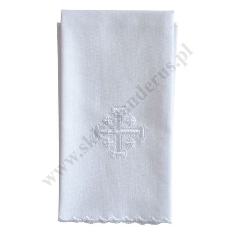 Puryfikaterz w formacie 25 x 48 cm z ozdobnym hafem krzyża jerozolimskiiego, obszyty białą nicią. Materiał 100 % bawełna.