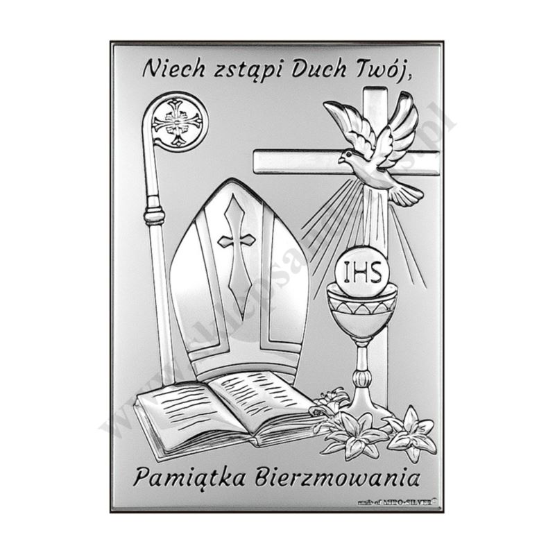 Pamiątka bierzmowania w postaci srebrnego obrazka o wymiarach 9 x 13 cm. PONIŻEJ W PRODUKTACH POWIĄZANYCH ISTNIEJE MOŻLIWOŚĆ ZAMÓWIENIA OKAZJONALNEJ DEDYKACJI NA TABLICZCE LUB REWERSIE OBRAZKA.