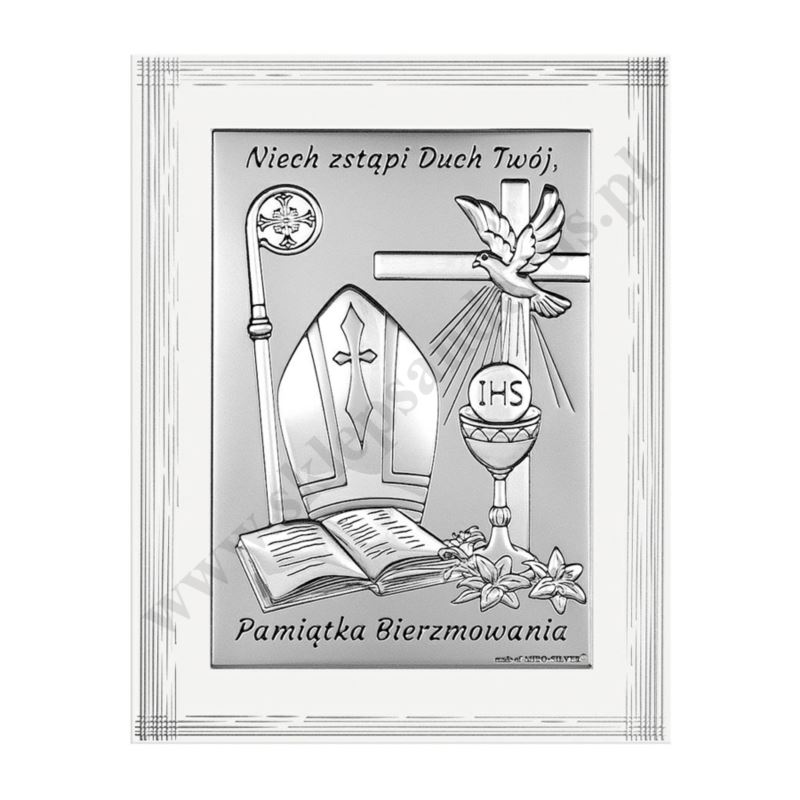 Pamiątka bierzmowania w postaci srebrnego obrazka o wymiarach 9 x 12 cm. PONIŻEJ W PRODUKTACH POWIĄZANYCH ISTNIEJE MOŻLIWOŚĆ ZAMÓWIENIA OKAZJONALNEJ DEDYKACJI NA TABLICZCE LUB REWERSIE OBRAZKA.