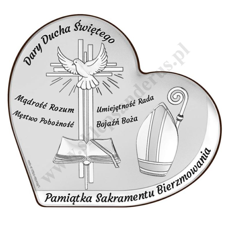 Pamiątka bierzmowania w postaci srebrnego obrazka o wymiarach 11 x 9.5 cm.