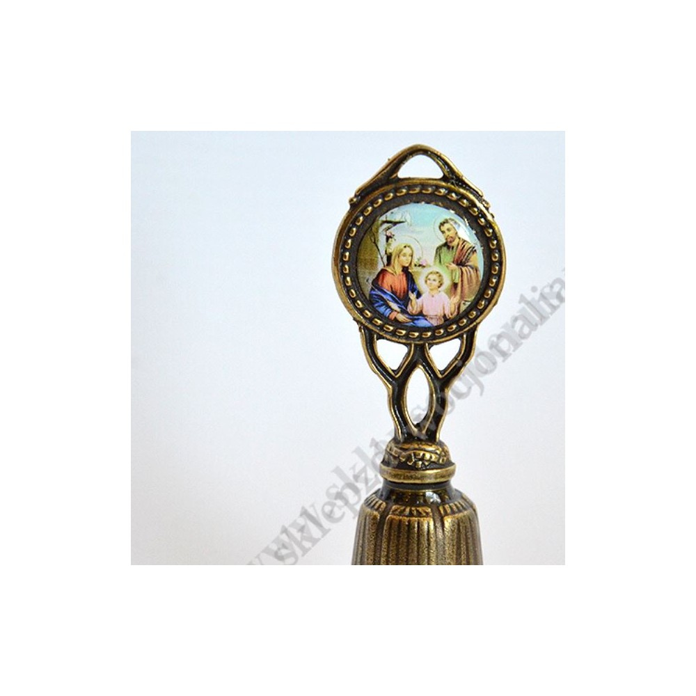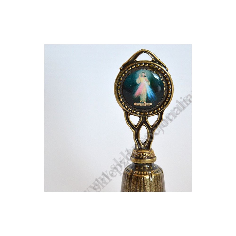 Dzwonek metalowy o wysokości 8.6 cm i średnicy 3.5 cm.