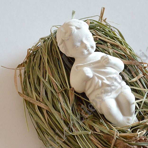 Figurka Dzieciątka Jezus z masy gipsowej na sianku.