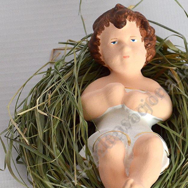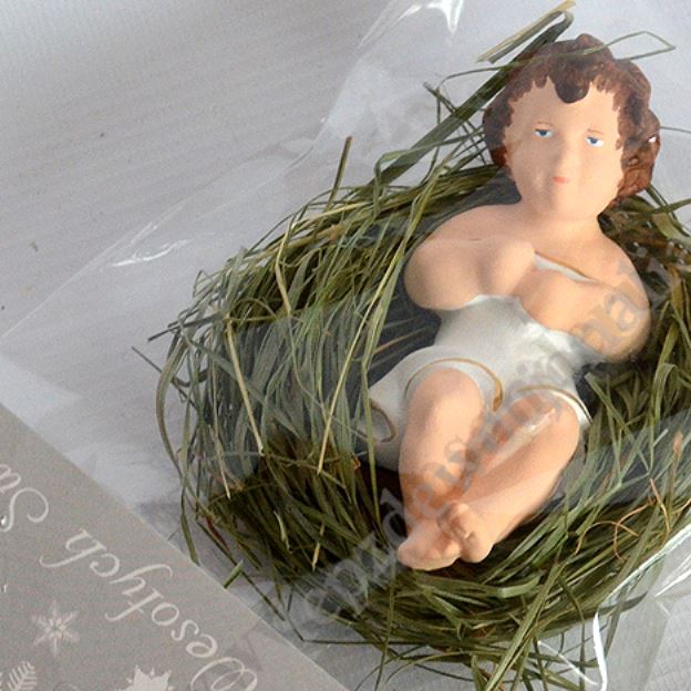 Dzieciątko na sianku wykonane z gipsu wypalanego, ręcznie malowane. Długość dzieciątka 9.5 cm, szerokość dzieciątka 4 cm.