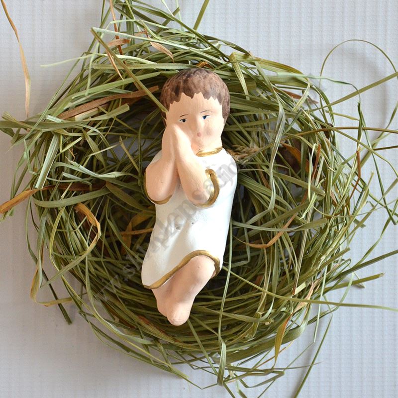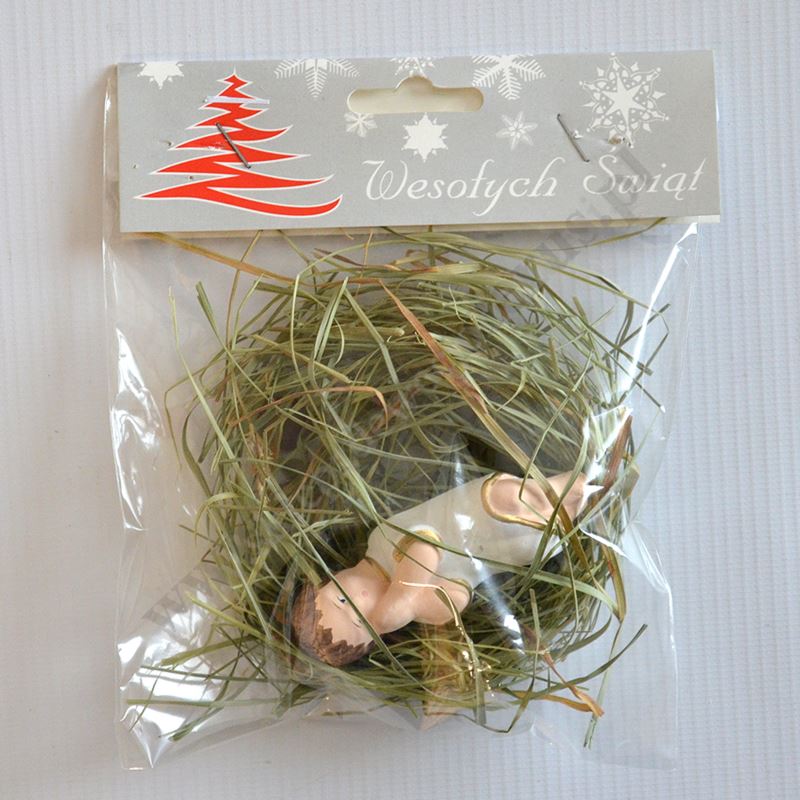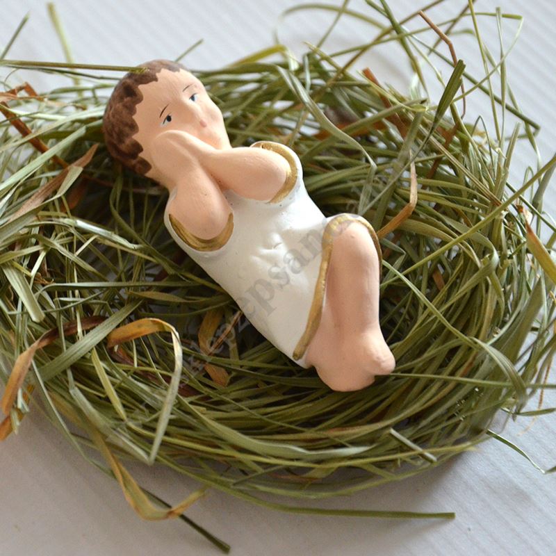 Gipsowe Dzieciątko Jezus na sianku. Długość Dzieciątka 7.5 cm.