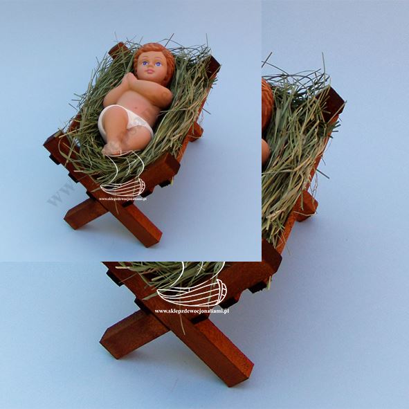 Figurka z masy gipsowej na sianku w drewnianym żłóbku