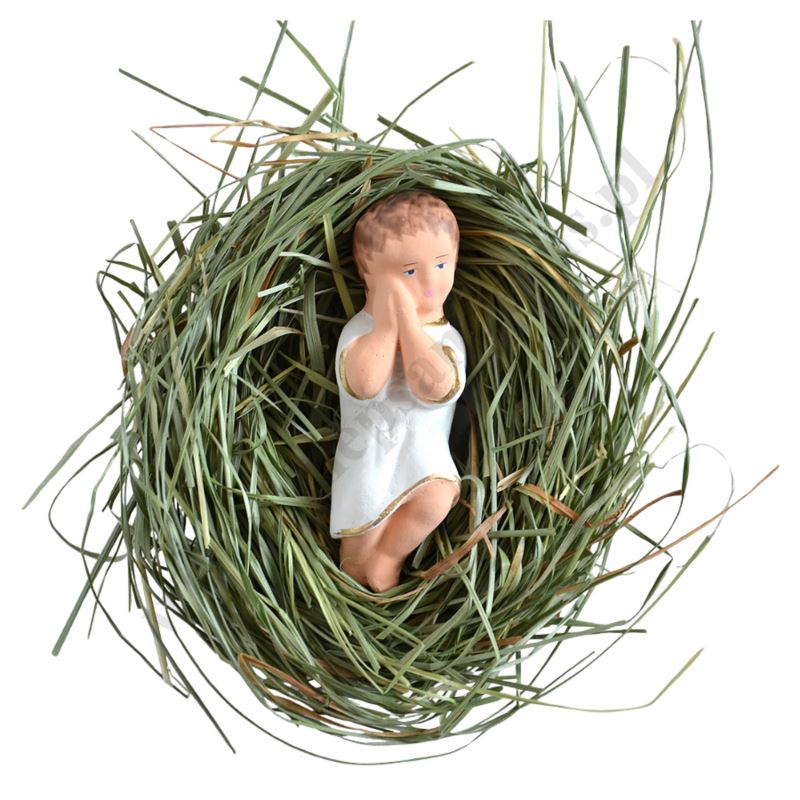 Gipsowa figurka Dzieciątka Jezus na sianku o wysokości 7 cm.