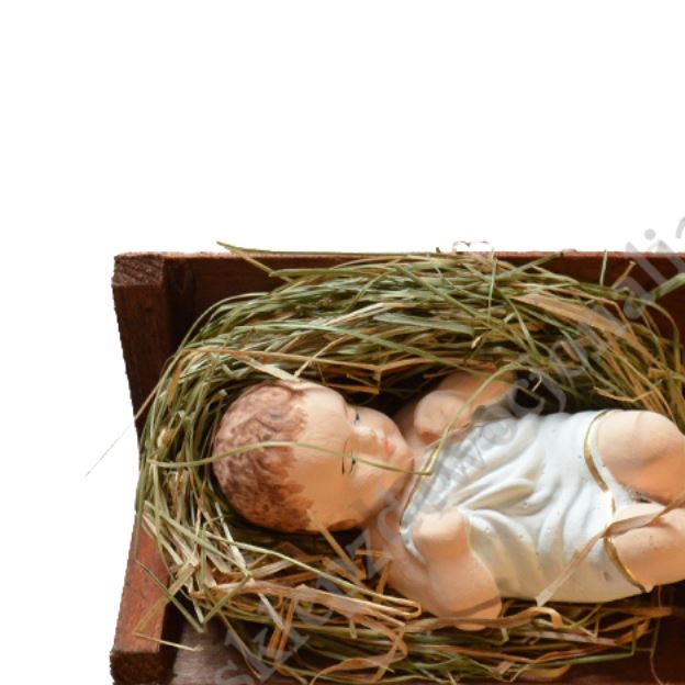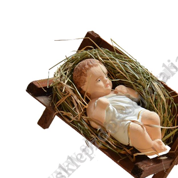 Dzieciątko w drewnianym żłóbku na sianku. Szerokość żłóbka 12 cm, wysokość żłóbka 7 cm, głębokość żłóbka 7 cm. Długość figurki 9.5 cm.