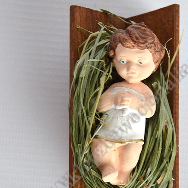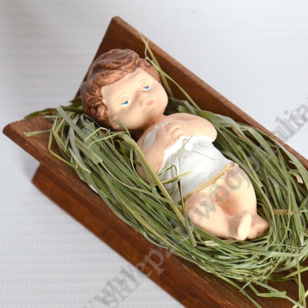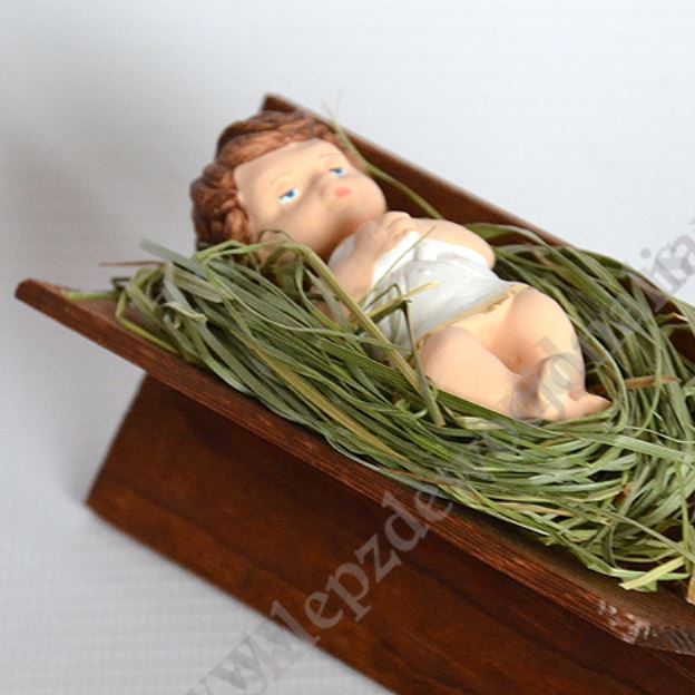Dzieciątko w drewnianym żłóbku na sianku, ręcznie malowane. Szerokość żłóbka 10 cm, wysokość żłóbka 4.5 cm, głębokość żłóbka 5 cm. Długość figurki 7 cm.