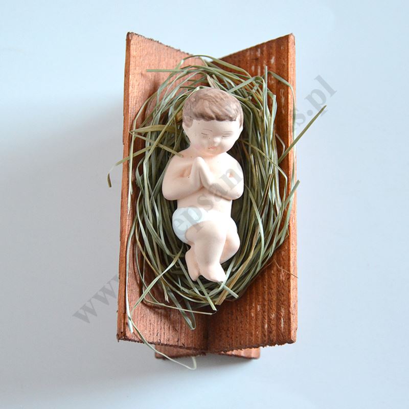 Dzieciątko Jezus wykonane z gipsu w drewnianym żłóbku na sianku.