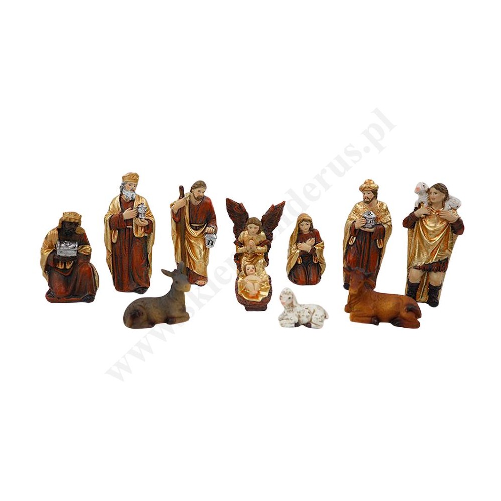 Figurki do szopki bożonarodzeniowej o wysokości najwyższej figurki 10 cm, wykonane z masy żywicznej, zestaw składa się z 11 figurek.