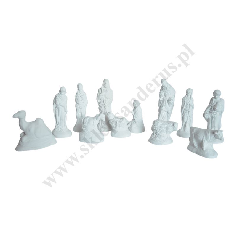 Komplet figurek do szopki bożonarodzeniowej wykonanych z gipsu o wysokości najwyższej figurki 12 cm.
