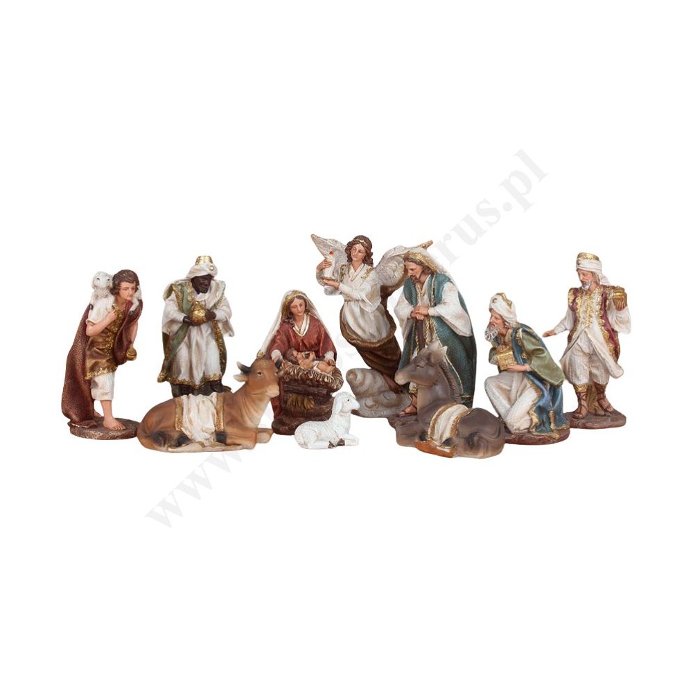 Figury do szopki bożonarodzeniowej o wysokości najwyższej figury 20.5 cm, w szatach z fakturą imitującą płótno, w eleganckiej pastelowo-złotej kolorystyce. Zestaw składający się z 10 elementów. Wykonane z masy żywicznej.