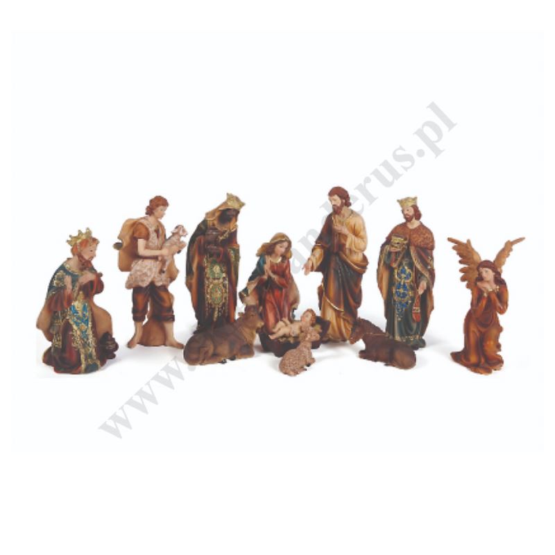 Figury do szopki bożonarodzeniowej. W kolorowych szatach ze złotymi zdobieniami. Zestaw składający się z 11 elementów, wykonane z masy żywicznej.