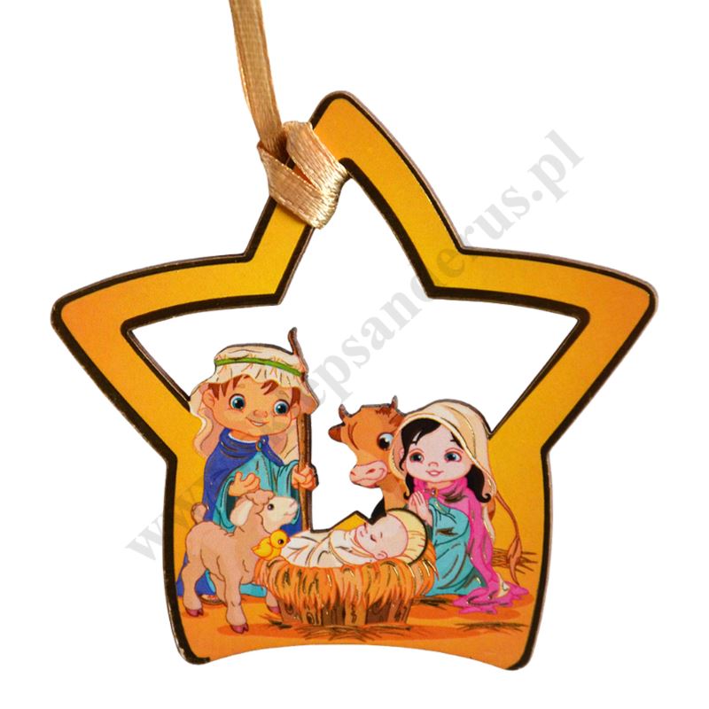 Bożonarodzeniowa gwiazdka do powieszenia wykonana ze sklejki o wysokości 6 cm i szerokości 6.5 cm.