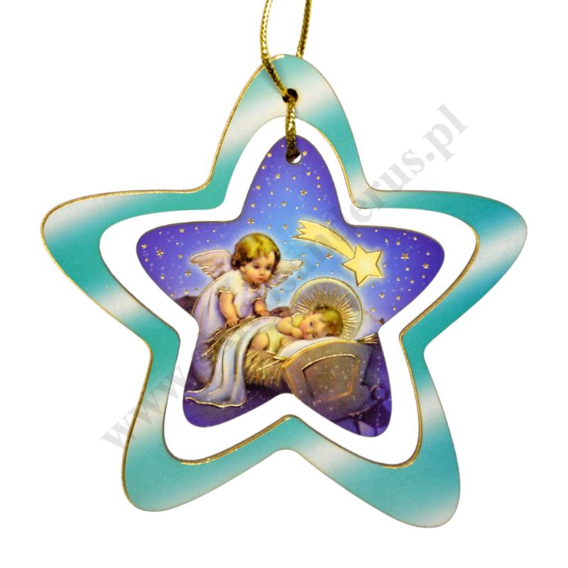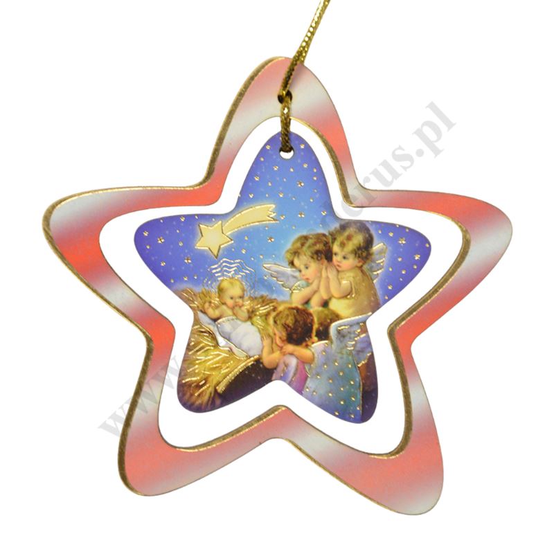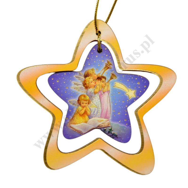 Ozdoba bożonarodzeniowa w postaci gwiazdki wykonanej w sklejce o wysokości 10 cm i szerokości 10 cm, sprzedaż w miksie wzorów.