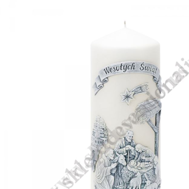 Świeca świąteczna o wysokości 21 cm i średnicy 8 cm z aplikacją szopki bożonarodzeniowej.