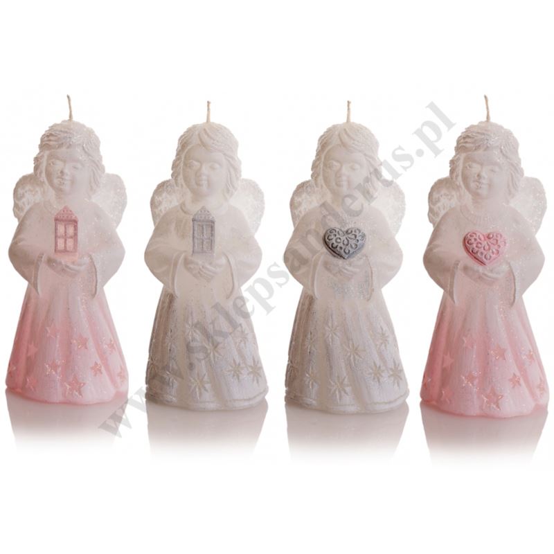 Świeca w postaci figurki aniołka o wysokości 10 cm i szerokości 4.5 cm. Sprzedaż w miksie wzorów.