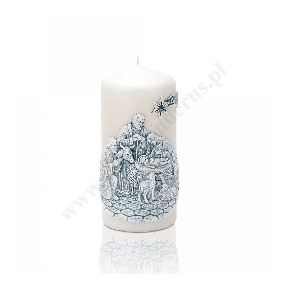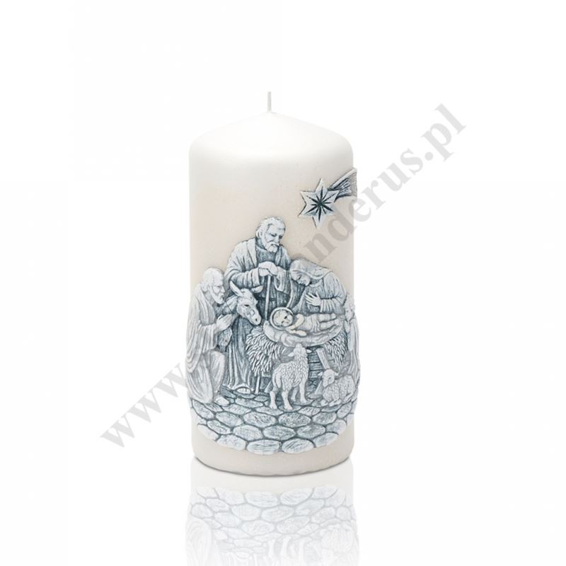 Świeca bożonarodzeniowa z aplikacją Świętej Rodziny o wysokości 12 cm i średnicy 6 cm.