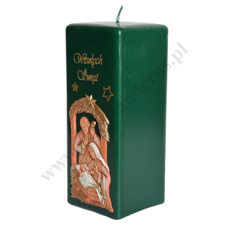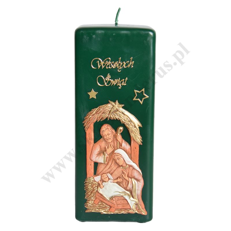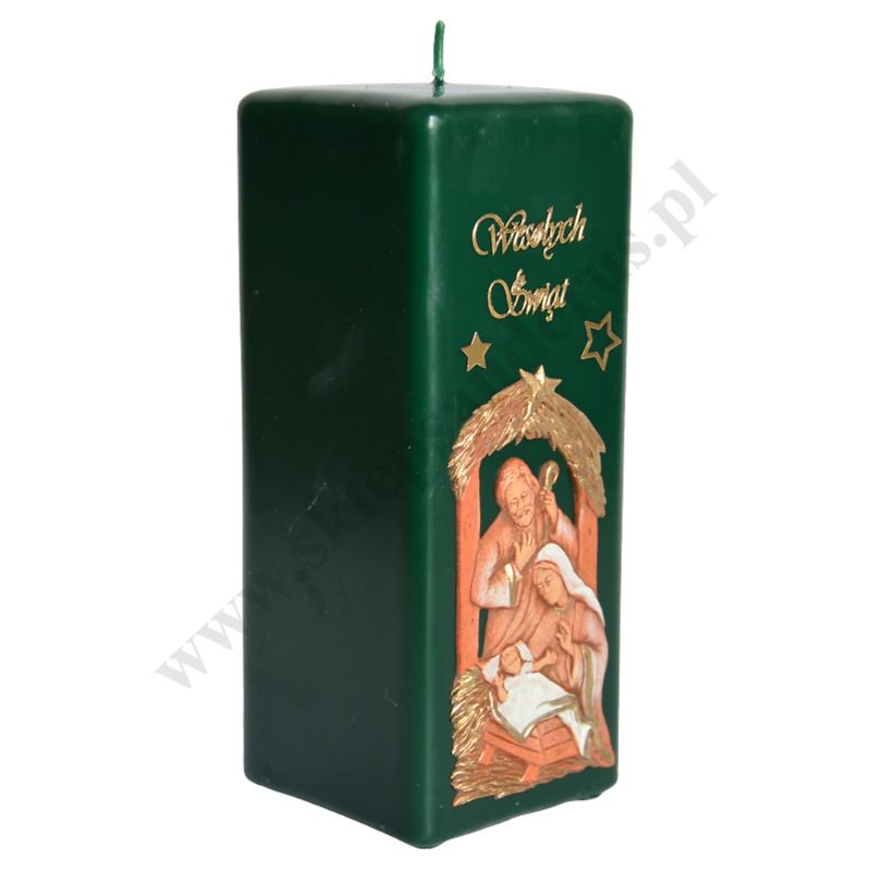 Świeca bożonarodzeniowa o wysokości 17 cm i szerokości 7 cm z parafinową aplikacją Świętej Rodziny.