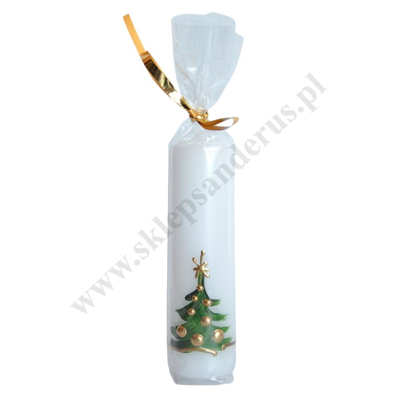 Świeca bożonarodzeniowa o wysokości 12.5 cm i średnicy 3.7 cm.