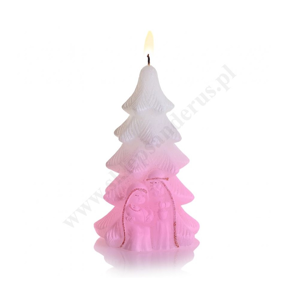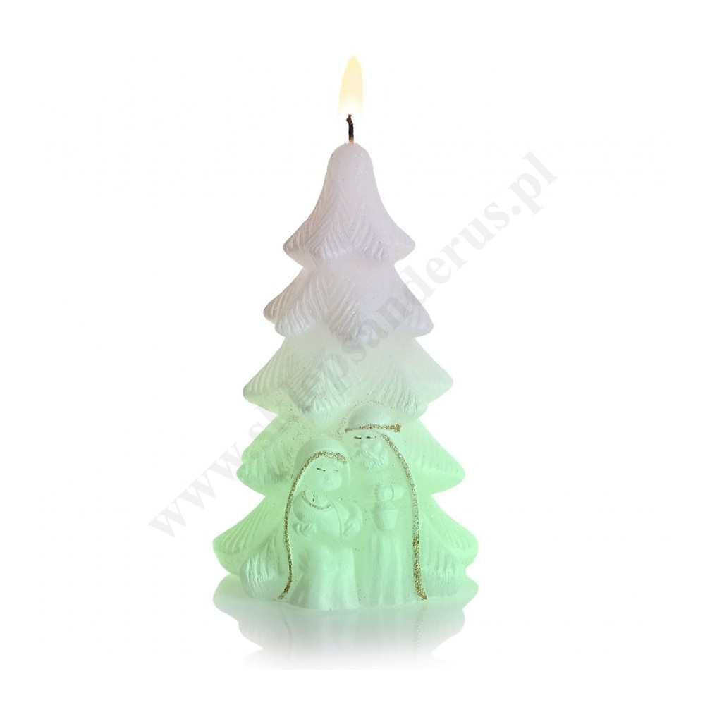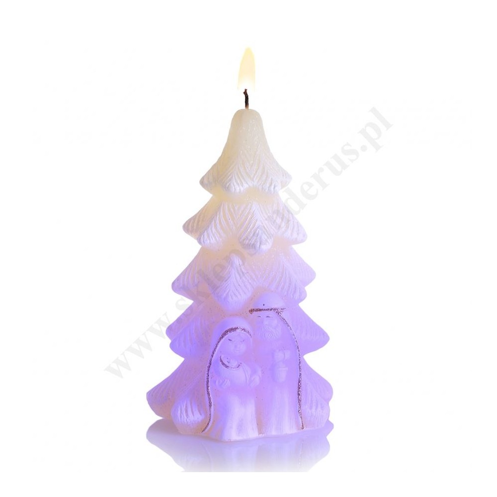 Świeca choinka z wizerunkiem Świętej Rodziny. W świecy wbudowany jest dodatkowo światłowód, który w momencie palenia się świecy sam daje naprzemiennie blask w trzech kolorach. Wysokość świecy 17 cm, szerokość 10 cm.