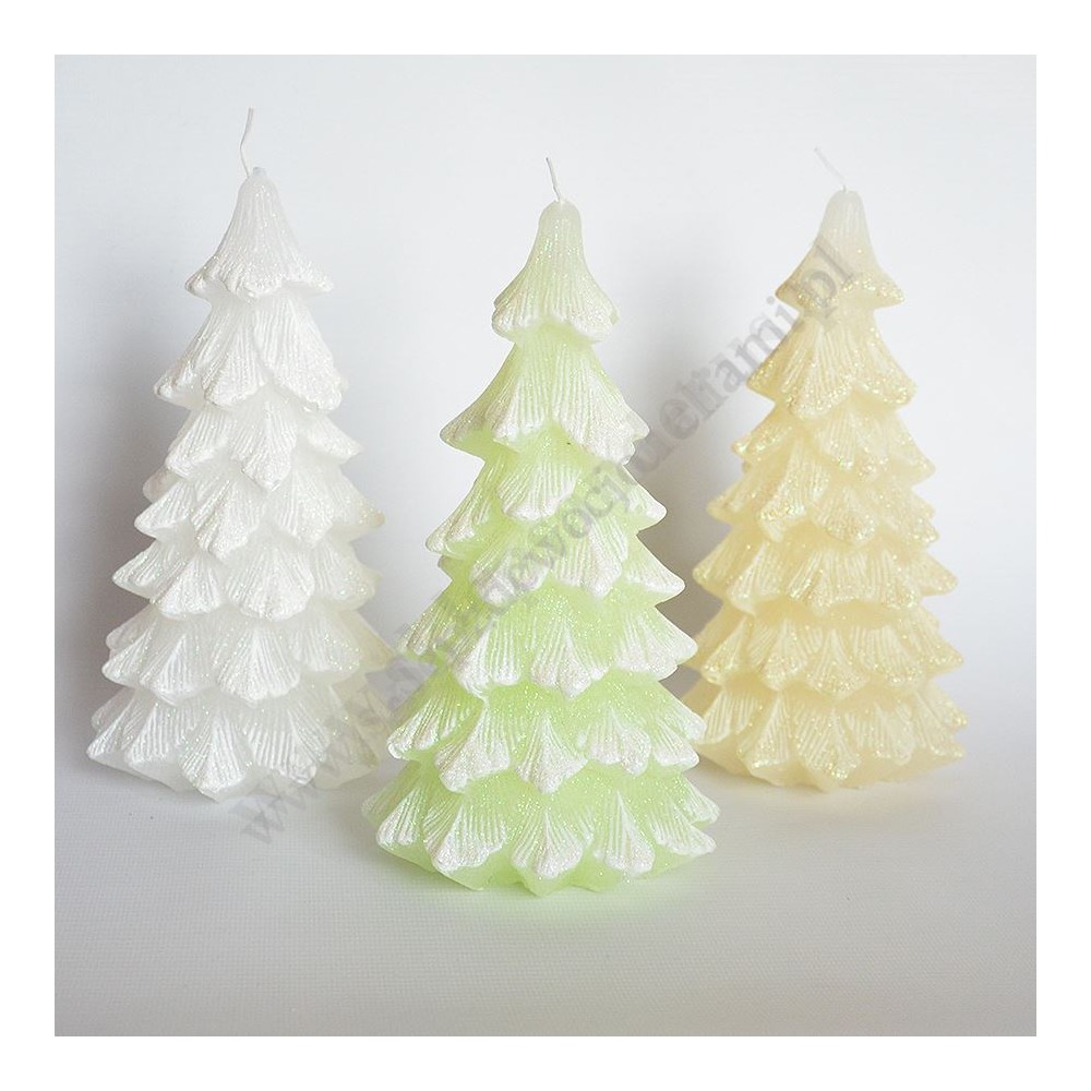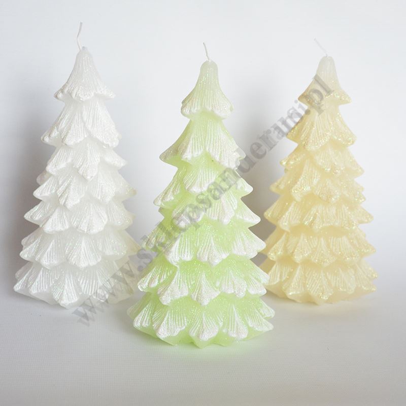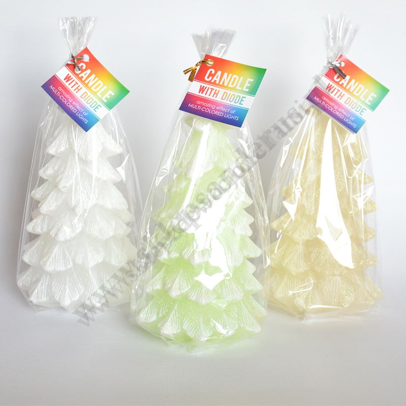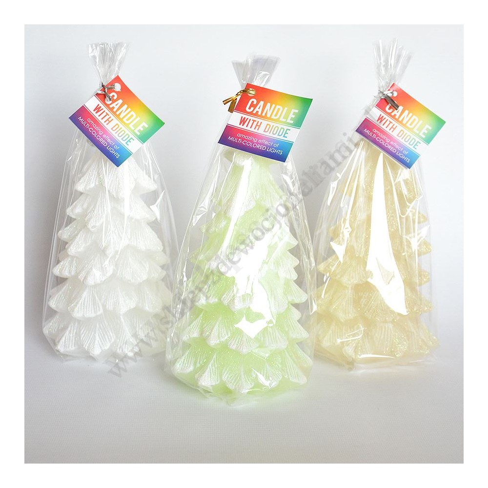 Świeca bożonarodzeniowa przedstawiająca choinkę o wysokości 20 cm i szerokości 10.5 cm. Wewnątrz świecy znajduje się dioda, która pod wpływem ciepła zmienia kolory. Sprzedaż w miksie wzorów.