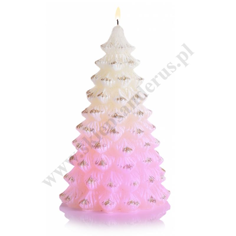 Świeca choinka o wysokości 22 cm i szerokości 12.5 cm. W świecy dodatkowo wbudowany jest światłowód, który w momencie palenia się świecy podświetla ją od wewnątrz. Sprzedaż w miksie kolorów.